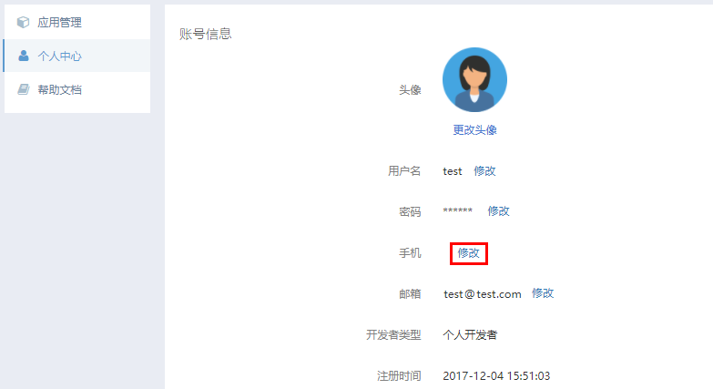 步骤3 在左侧导航栏中,单击【个人中心】,在账号信息中,单击【手机】项后的【修改】。
