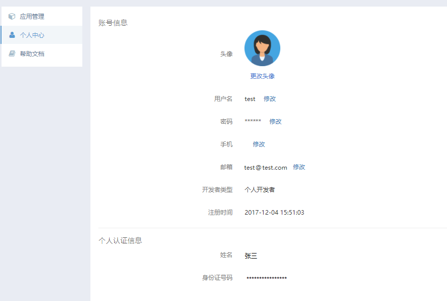 账号信息:包括用户名、手机号、邮箱等基本信息。单击各项后的【修改】,可修改个人信息。